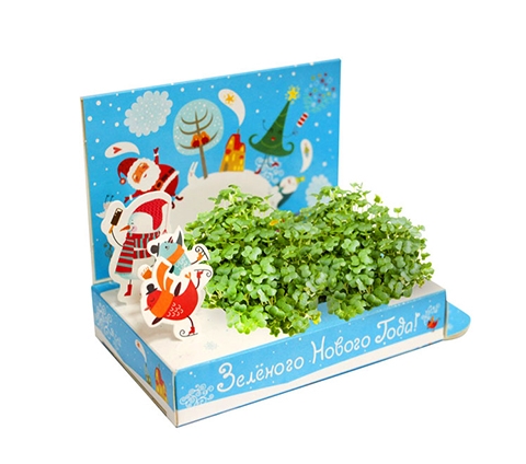 Живая открытка - это удивительный и очень красивый подарок. Маленький садик на вашем столе будет радовать зеленью и зимой, и летом.Открытка представляет собой коробочку, с одной стороны есть место для написания ваших пожеланий.Откройте открытку, высыпьте семена в контейнер, где находится специальный материал для проращивания. Уже через 3-4 дня в открытке вырастет пышный газон из зелени. В комплекте вы найдете 3 тематические фигурки. Их можно разестить рядом с газончиком, вставив в специальные отверстия, а можно поставить прямо в травку. Не забывайте поливать ваш мини-садик, и он будет радовать вас долго.