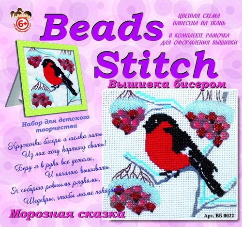 Серия "Вышивка бисером в рамочке". Серия сочетает в себе два вида вышивки - бисером и нитками мулине. Яркая схема для вышивки нанесена на ткань, что позволяет создать красочные сюжеты. В комплекте предусмотрено оформление вышивки с помощью рамочки, заготовки для рамочки есть в наборе. Размер изделия 120*120 мм