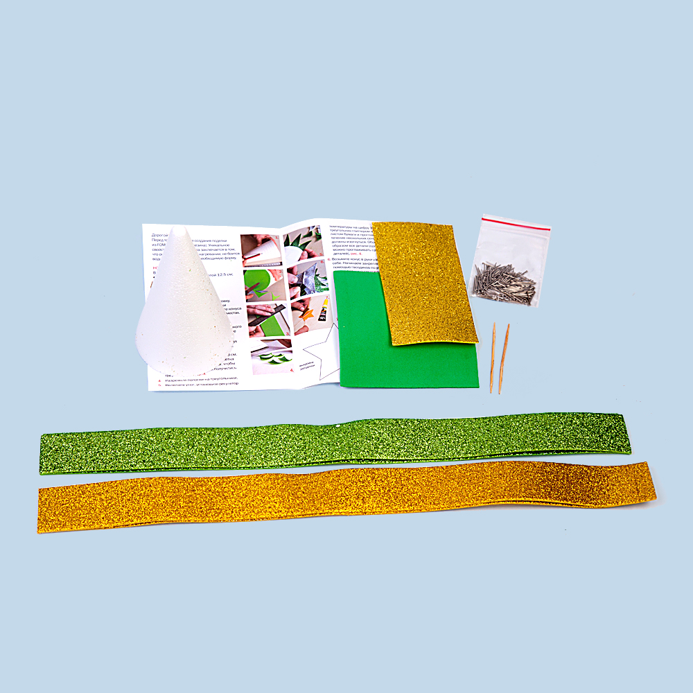 - В наборе: пенопластовый конус, листы фоамиран, гвоздики-булавки, инструкция