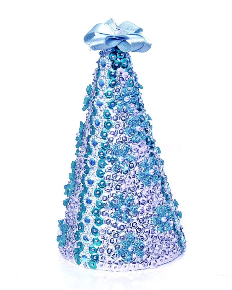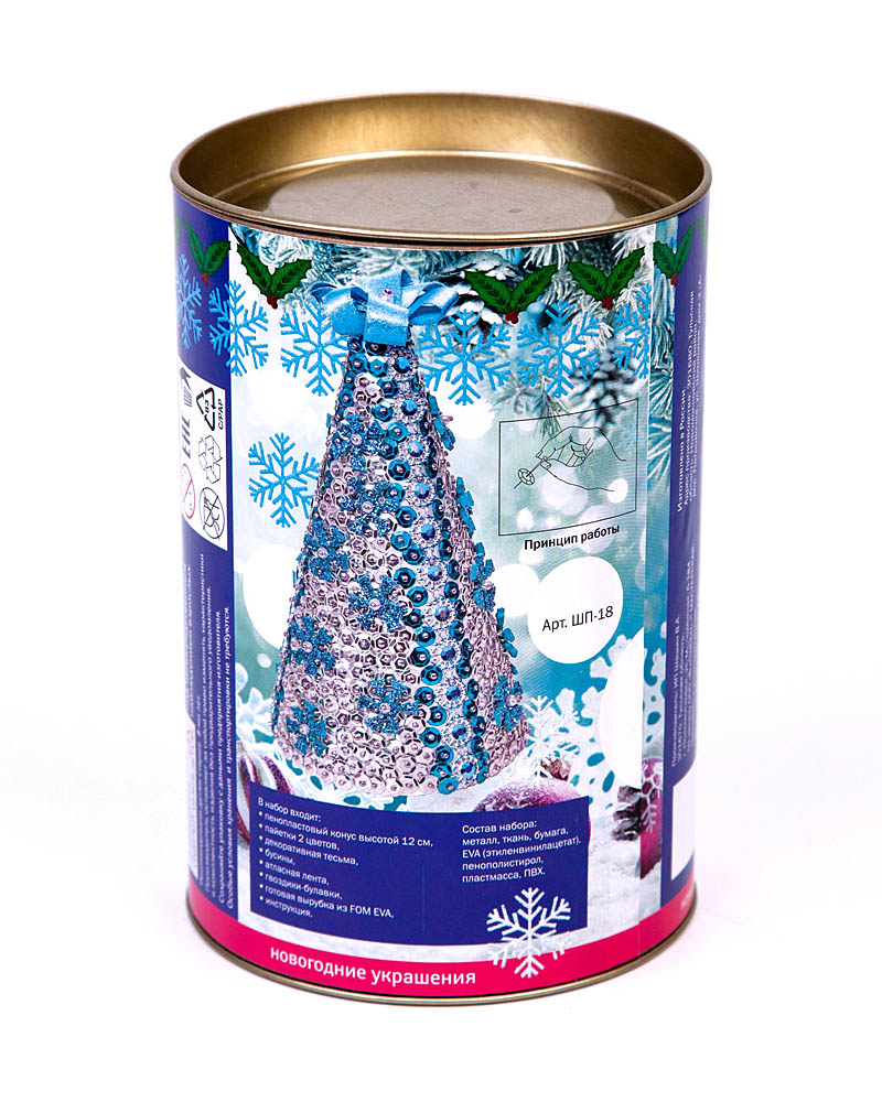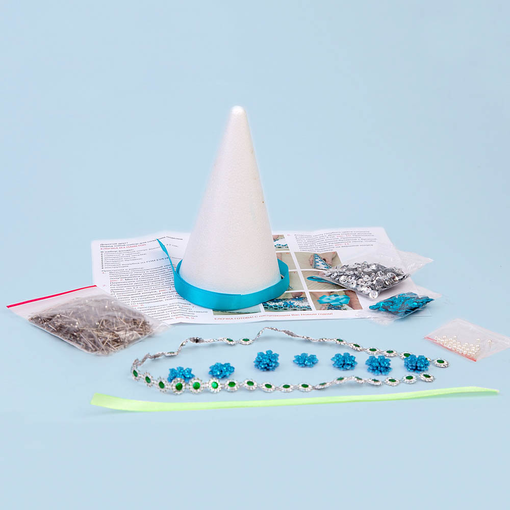 - В наборе: пенопластовый конус, пайетки 2-х цветов, бусины, атласная лента, декоративная тесьма, готовая вырубка из FOM EVA, гвоздики-булавки, инструкция