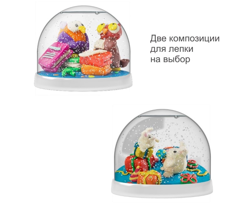 Как это работает? Слепите фигурку или композицию из пластилина. Следуя инструкции, разместите вашу фигуру внутри прозрачной сферы, затем заполните сферу специальной жидкостью и добавьте снежные блестки. Ваш Волшебный шар готов! Потрясите его, и посмотрите, как красиво кружатся внутри маленькие снежинки. Это настоящее волшебство!