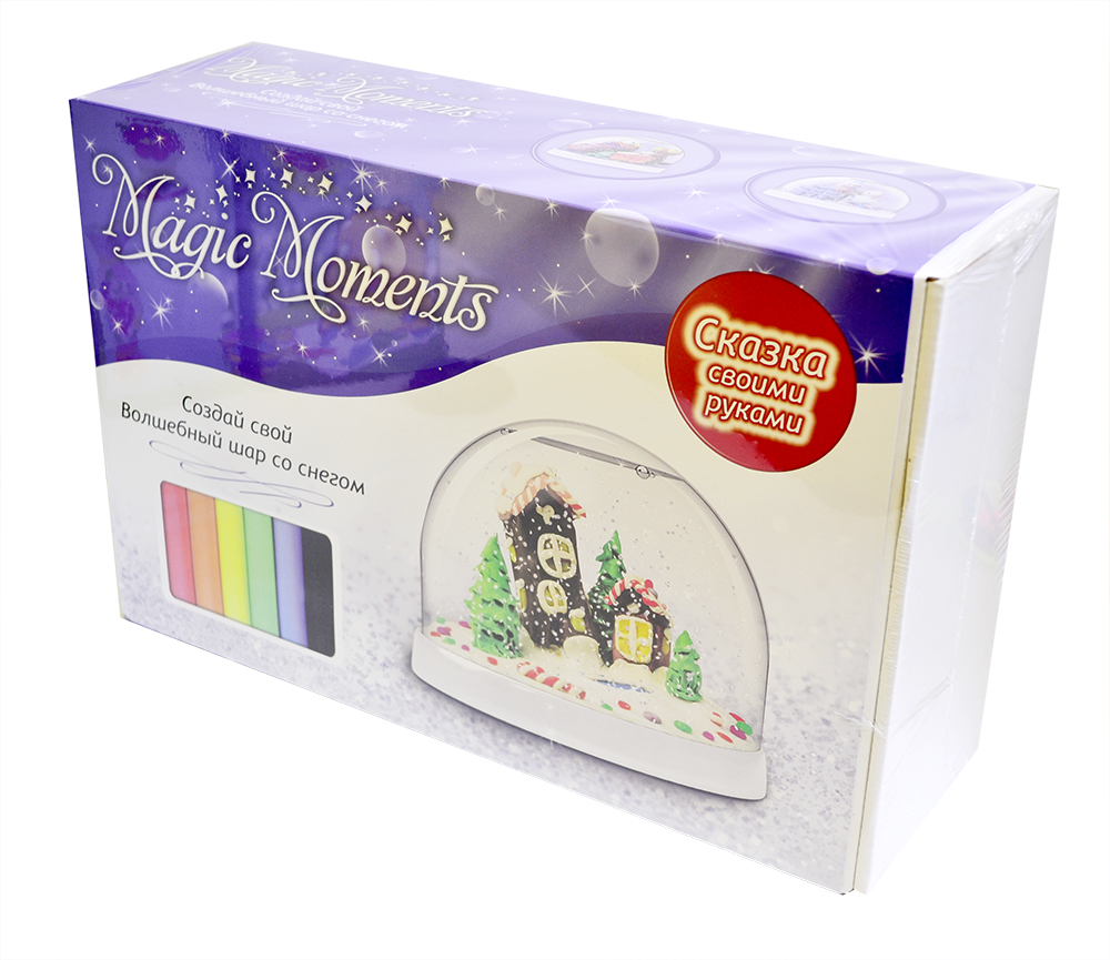 Как это работает? Слепите фигурку или композицию из пластилина. Следуя инструкции, разместите вашу фигуру внутри прозрачной сферы, затем заполните сферу специальной жидкостью и добавьте снежные блестки. Ваш Волшебный шар готов! Потрясите его, и посмотрите, как красиво кружатся внутри маленькие снежинки. Это настоящее волшебство!