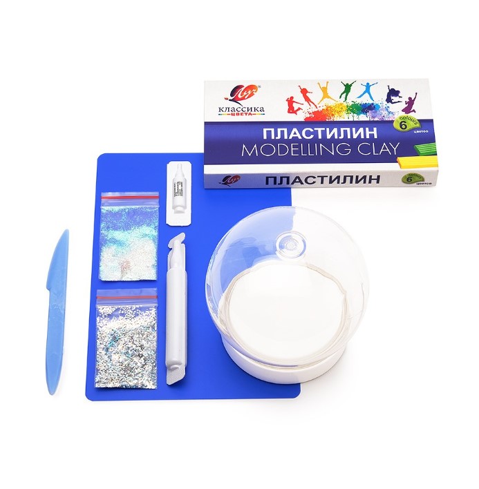 - В наборе: инструкция, сферическая форма для изготовления сувенира, цветной пластилин, доска для лепки, подставка для композиции, цветные блестки, глицерин, полиэтиленгликоль
