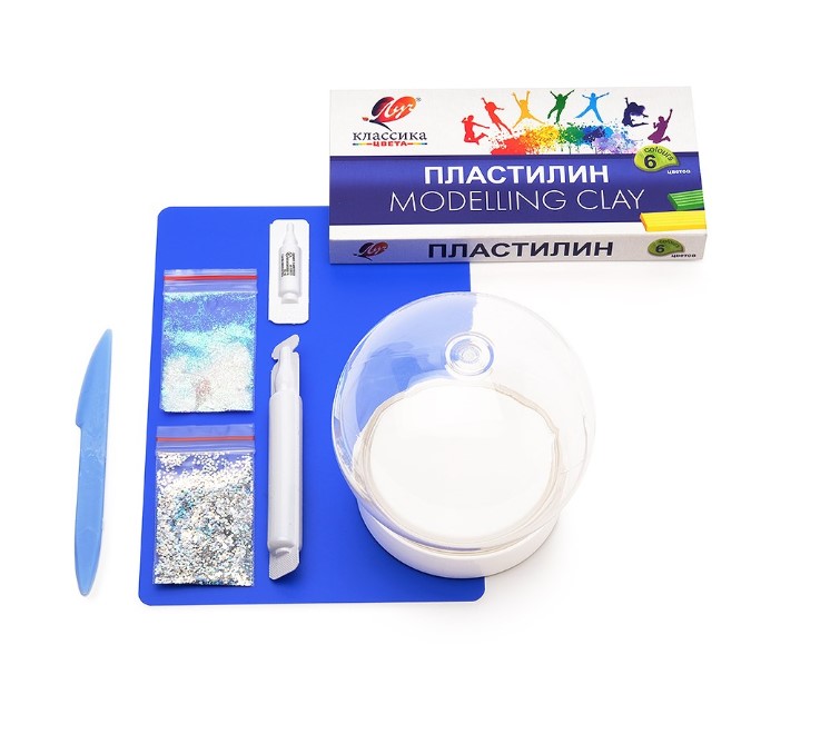 - В наборе: инструкция, сферическая форма для изготовления сувенира, цветной пластилин, доска для лепки, подставка для композиции, цветные блестки, глицерин, полиэтиленгликоль