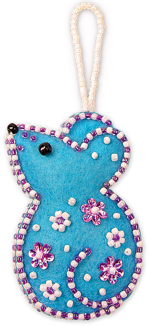 Милая мышка - стилизованная двусторонняя набивная игрушка из голубого фетра, декорированная разноцветным бисером и блестящими пайетками. С помощью набора "Милая мышка" ребёнок старше 8 лет научится шить простые игрушки и вышивать несложные декоративные узоры: вырежет 2 детали из фетра, декорирует их пайетками с бисером, сошьёт их по краю простыми стежками, наполнит синтепухом, пришьёт подвес из бисера. Фигурку можно использовать как новогоднюю игрушку или брелок для сумочки.