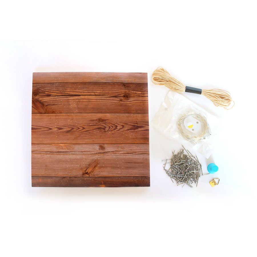 - В наборе: основа с нанесенным рисунком и схемой, нитки мулине, гвоздики, наперсток, подвес, светодиодная нить, инструкция
