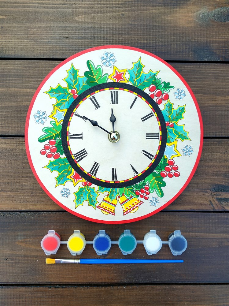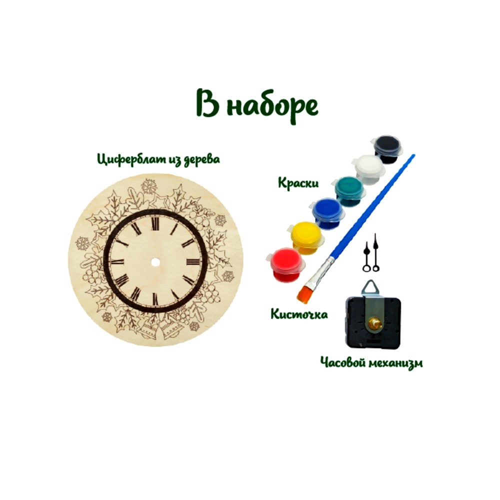 - В наборе: деревянная заготовка под раскрашивание, часовой механизм, краски и кисточка