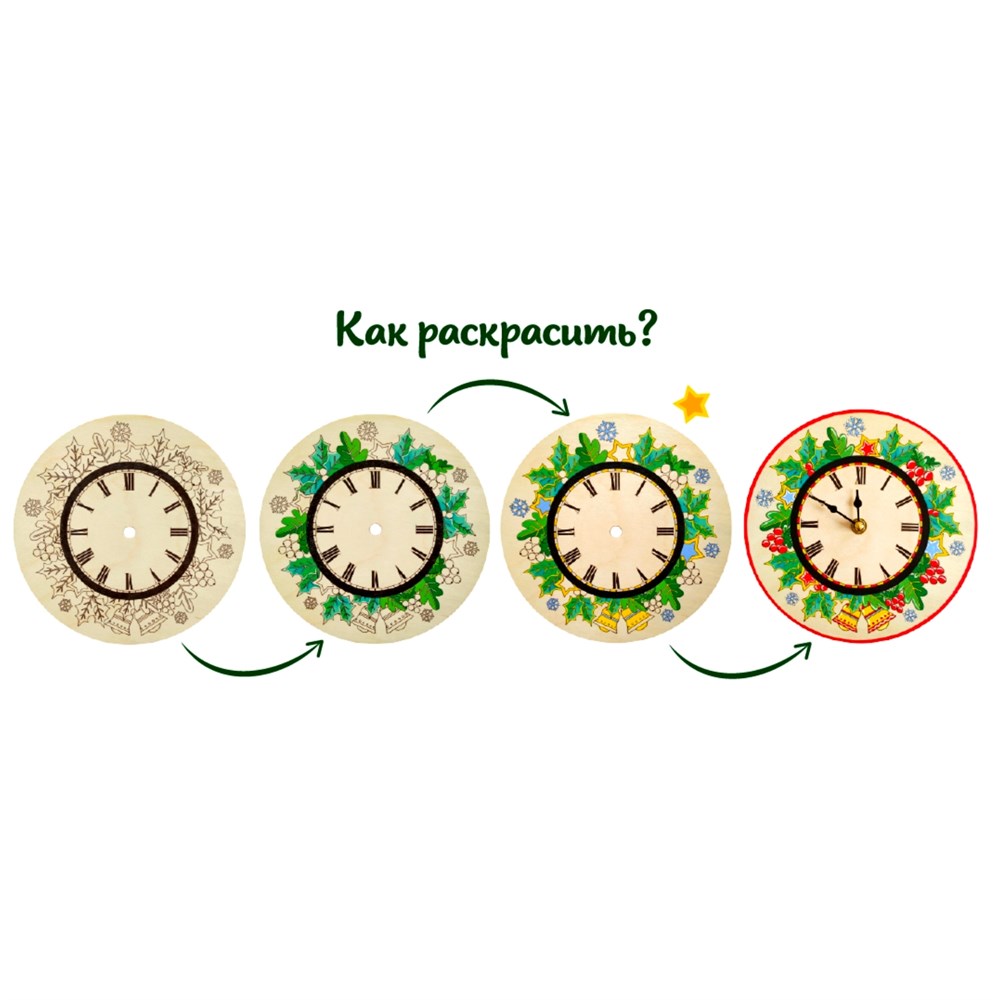 В наборе: деревянная заготовка под раскрашивание, часовой механизм, краски и кисточка