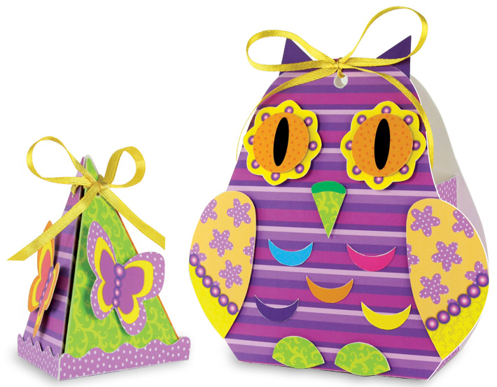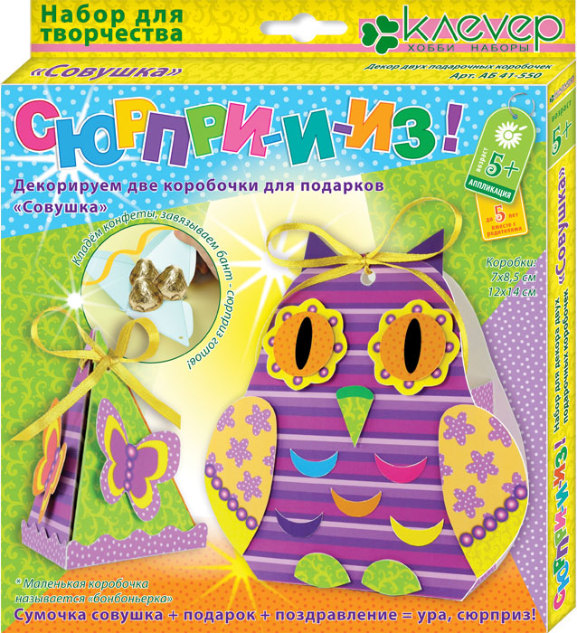 Все картонные детали коробочек готовы, - их только нужно вынуть из основы и склеить; бумажные детали несложных форм - их легко вырезать и наклеить на детали коробочек с помощью двусторонней клеящейся ленты вместо клея. Бант из ленты скрепит стороны коробочки и украсит её макушку - работа над набором будет приятна и вам, и ребёнку.
