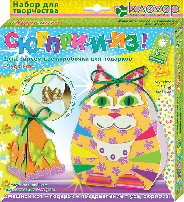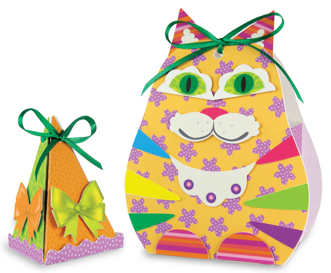 Все картонные детали коробочек готовы, - их только нужно вынуть из основы и склеить; бумажные детали несложных форм - их легко вырезать и наклеить на детали коробочек с помощью двусторонней клеящейся ленты вместо клея. Бант из ленты скрепит стороны коробочки и украсит её макушку - работа над набором будет приятна и вам, и ребёнку.