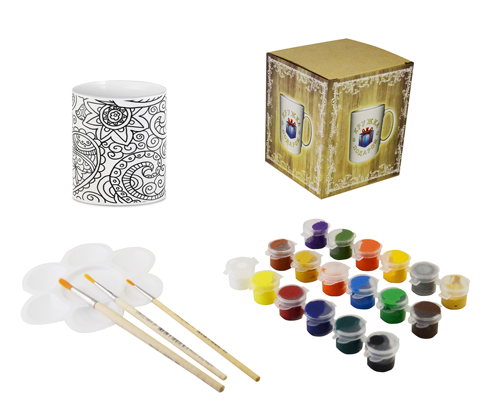 - В наборе: кружка 300 мл, краски 18 цветов, 3 кисти, палитра