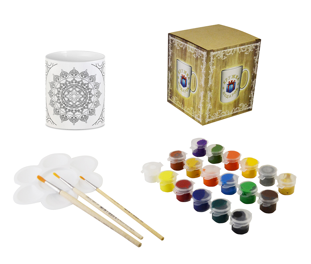 - В наборе: кружка 300 мл, краски 18 цветов, 3 кисти, палитра