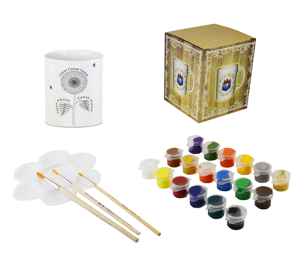 - В наборе: кружка 300 мл, краски 18 цветов, 3 кисти, палитра