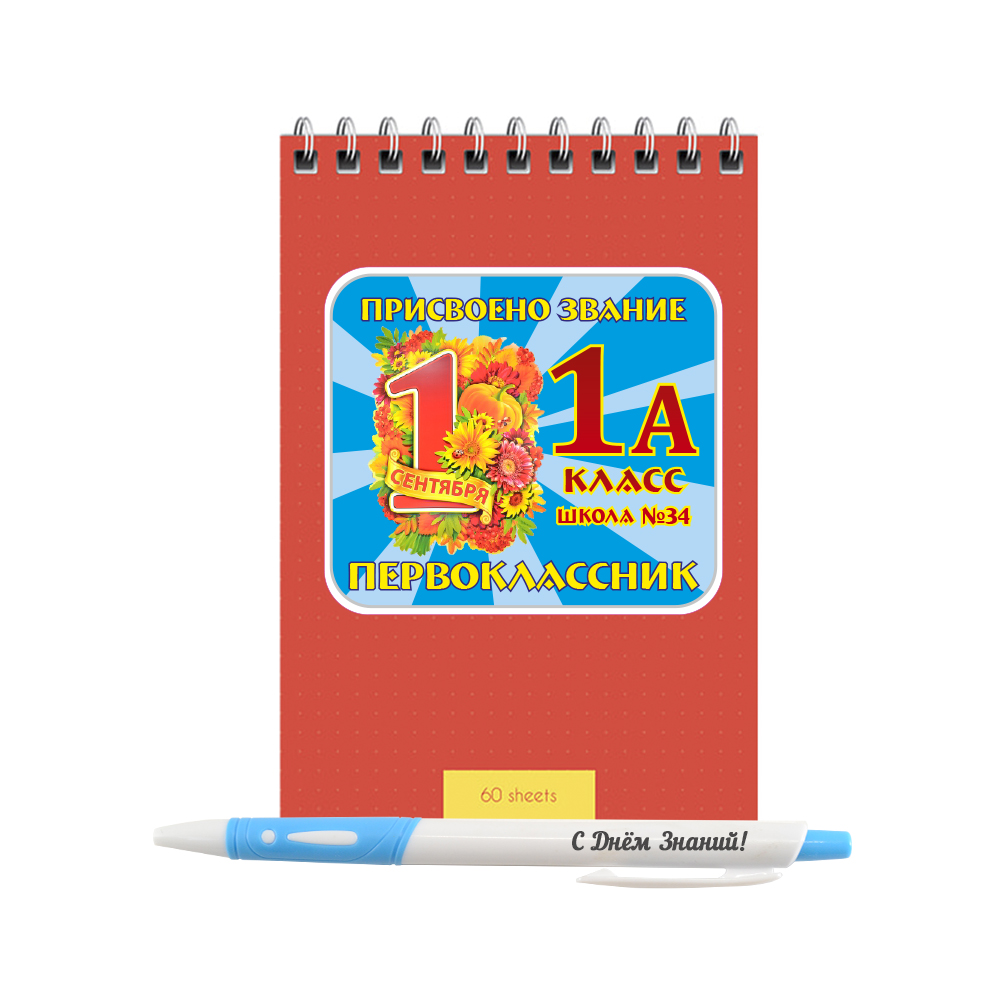 Именной подарочный набор, блокнот и ручка "Присвоено звание первоклассник 1А"