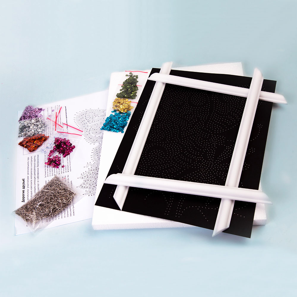 - В наборе: планшет из пенопласта, цветной фон с точечным рисунком, схема с номерами и указанием цветовой гаммы, пайетки, гвоздики-булавки для накалывания пайеток, рамка из пенопласта для оформления картины, инструкция