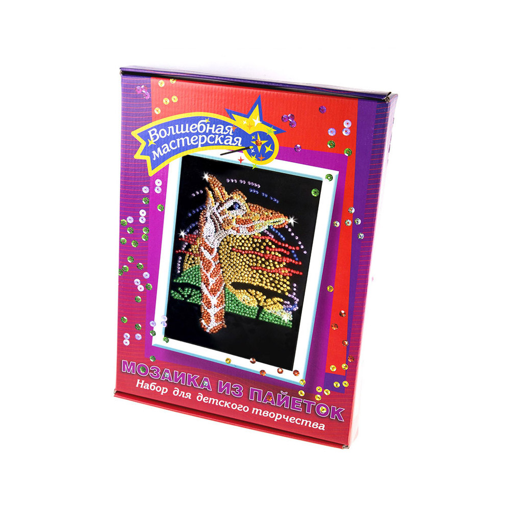 Мозаика из пайеток - новое, позитивное занятие для проведения семейного досуга. Ваш ребенок самостоятельно или вместе с Вами соберет прекрасную картину, которая станет великолепным подарком близким и друзьям или стильным интерьерным украшением, созданным юным творцом. В процессе сборки у ребенка развивается прежде всего мелкая моторика, усидчивость, внимание, умение работать по схеме. Все необходимое включено в комплект, в том числе пошаговая подробная инструкцию. Попробуйте – и Вы испытаете восторг от собственных безграничных возможностей!