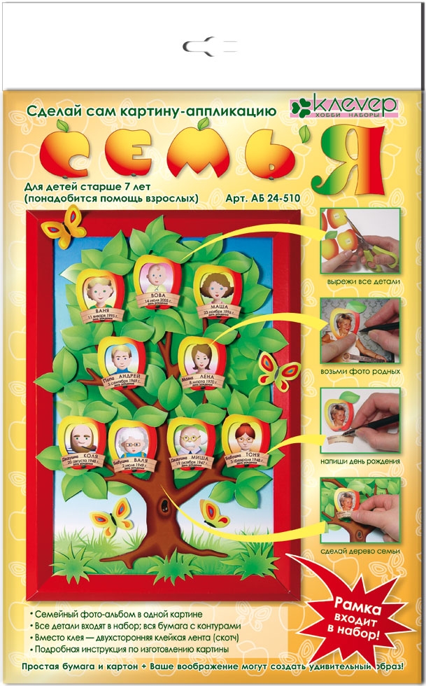 Семья - самое важное в жизни ребёнка. С помощью набора "СемьЯ" ребёнок научится создавать свою родословную, вести историю своей семьи: он сам, его родители, родители его родителей... Нужно только вырезать детали, подобрать фотографии родственников, наклеить их на объёмный скотч на картину, согнуть клапаны рамки - и получится картина с настоящим генеалогическим древом. Клей не понадобится