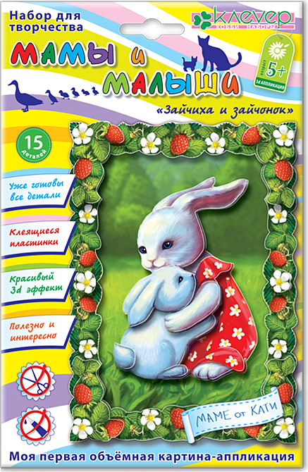 Картина "Зайчиха и зайчонок" создана для совместных занятий мамы и ребёнка старше пяти лет. Мамина любовь даётся ребёнку при рождении и остаётся с ним на всю жизнь: трогательные и нежные персонажи этой картины - мама-зайчиха и зайчонок - передают всю палитру тёплых взаимных чувств. >Набор научит ребёнка создавать объёмную картину в упрощённой технике аппликации. Создать 3-d картину легко: картонные детали, которые уже готовы и не требуют вырезания, нужно подобрать по изображению и наклеить послойно друг на друга в порядке указанной нумерации при помощи квадратиков объёмного клеящего материала (скотча).