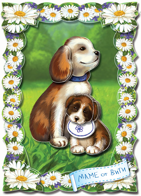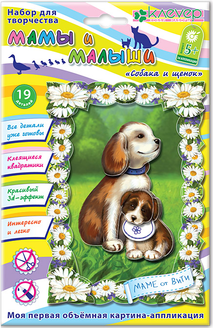 Картина "Собака и щенок" создана для совместных занятий мамы и ребёнка старше пяти лет. Мамина любовь даётся ребёнку при рождении и остаётся с ним на всю жизнь: трогательные и нежные персонажи этой картины - мама-собака и щенок - передают всю палитру тёплых взаимных чувств. Набор научит ребёнка создавать объёмную картину в упрощённой технике аппликации. Создать 3-d картину легко: картонные детали, которые уже готовы и не требуют вырезания, нужно подобрать по изображению и наклеить послойно друг на друга в порядке указанной нумерации при помощи квадратиков объёмного клеящего материала (скотча).