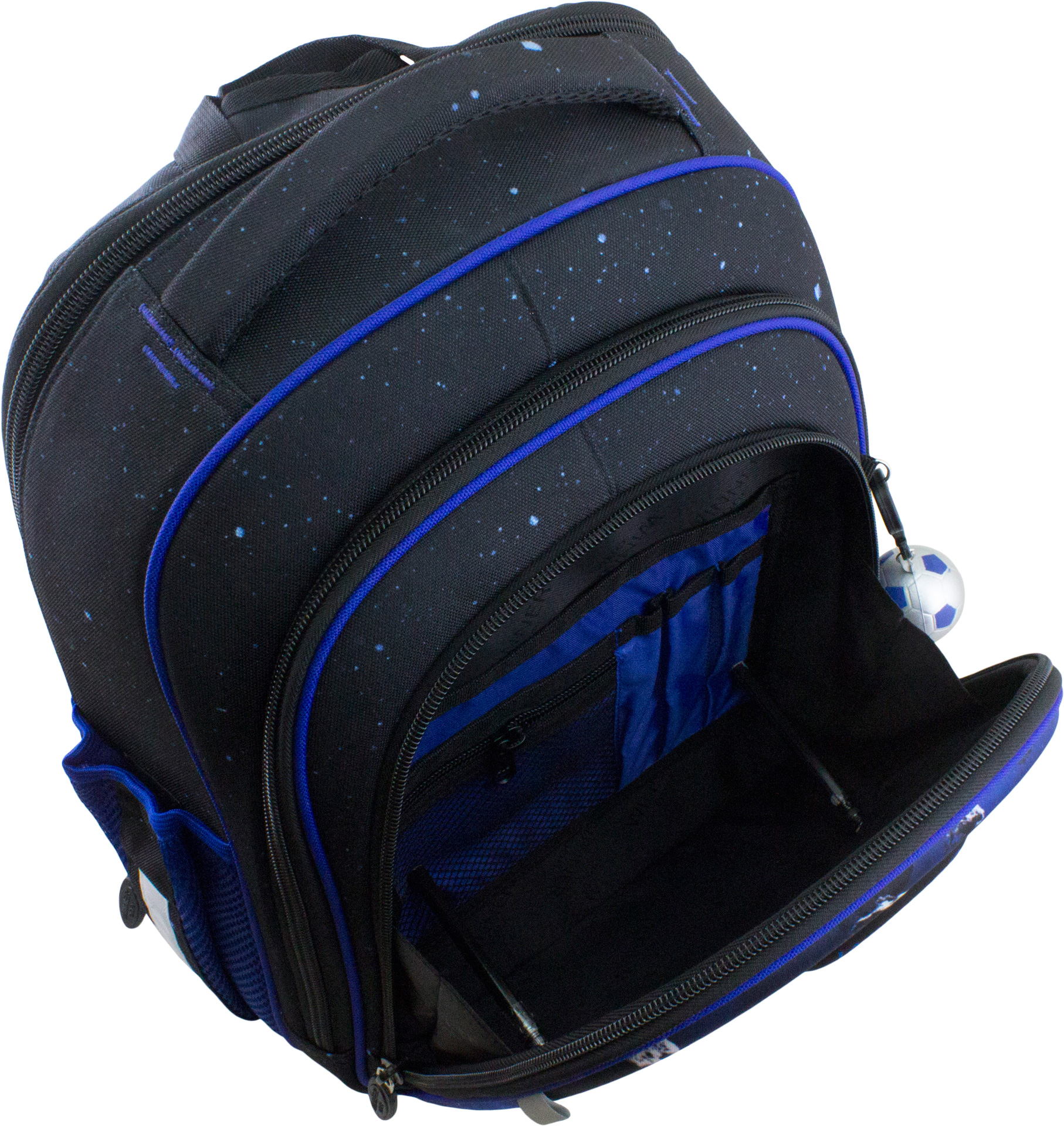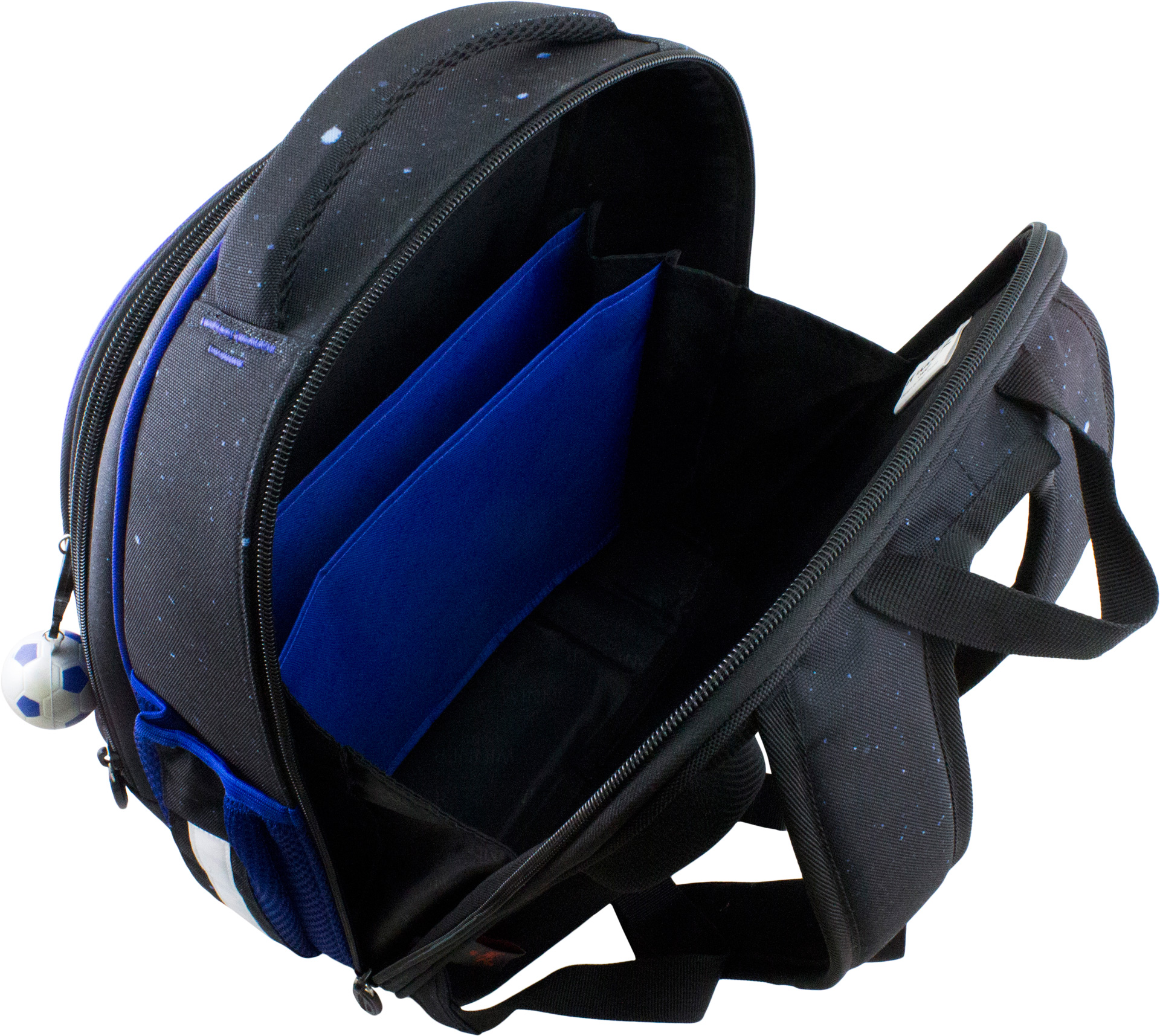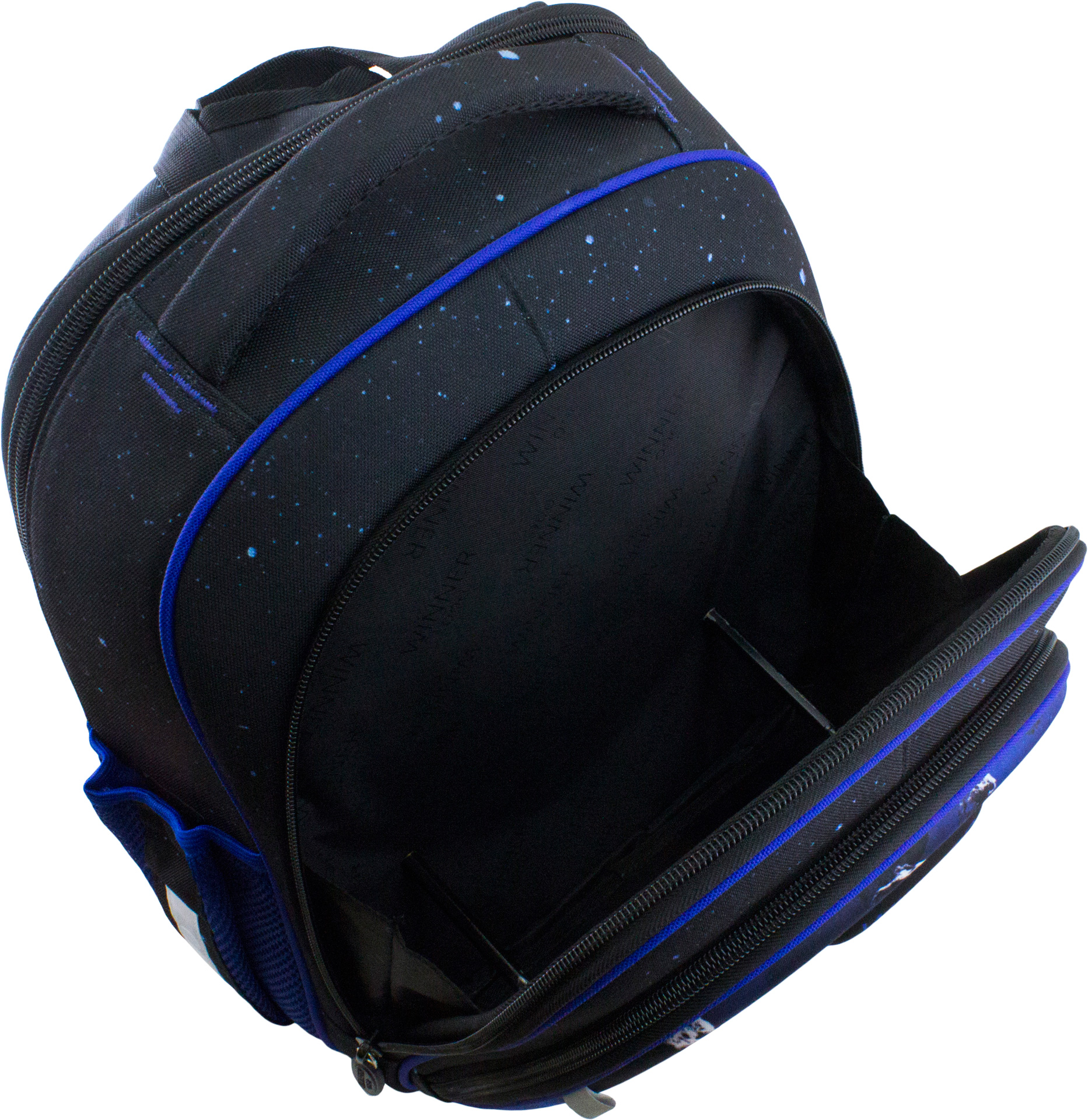Основное большое отделение у спины, с тканевыми разделителями, для школьных принадлежностей.