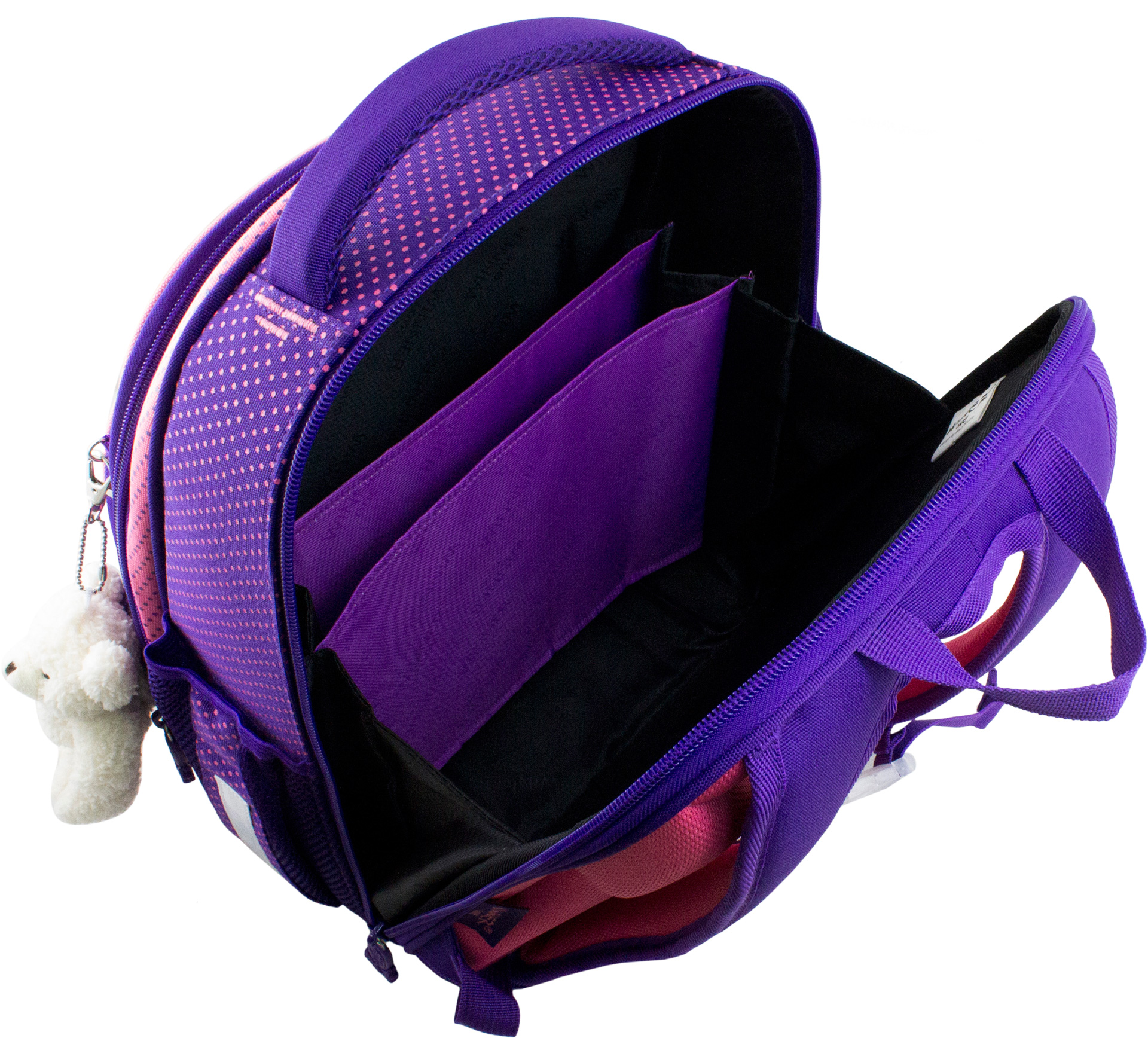 Основное большое отделение у спины, с тканевыми разделителями, для школьных принадлежностей.