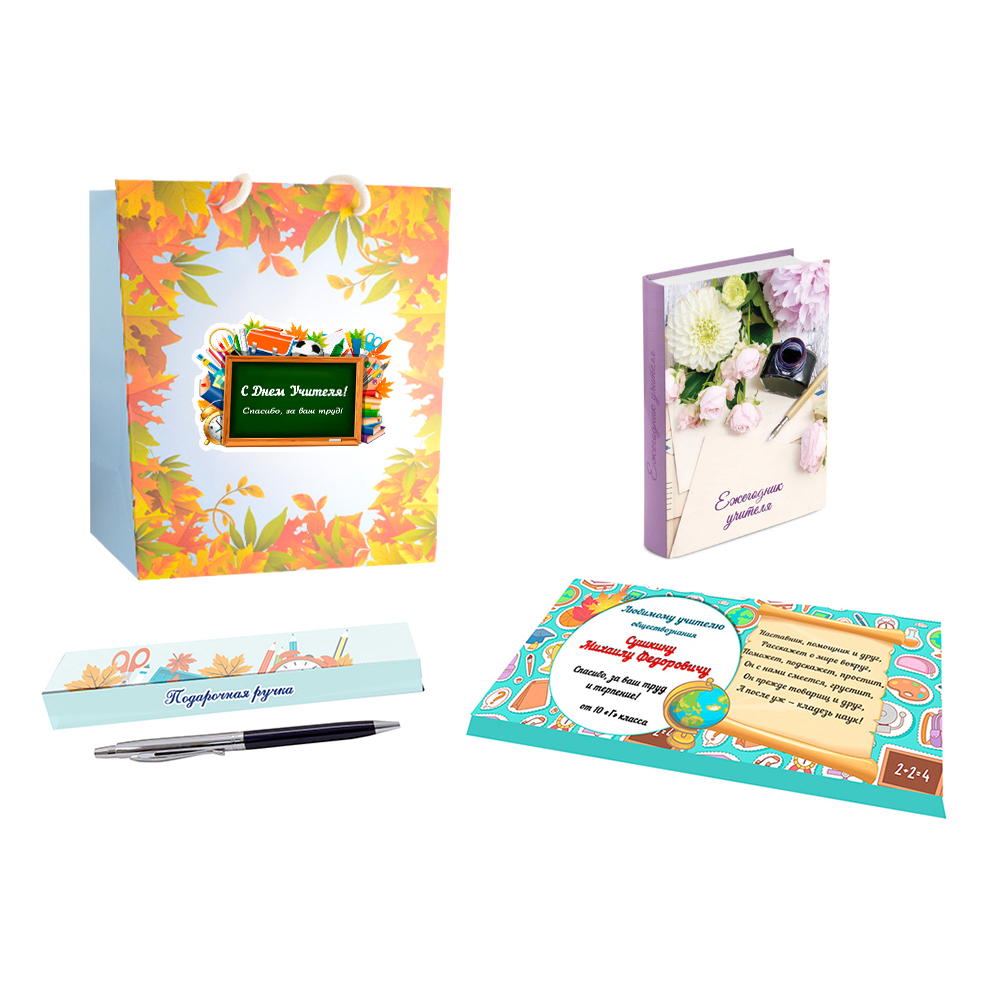 - В наборе: подарочный пакет, ручка в футляре, ежегодник учителя, конфеты Merci