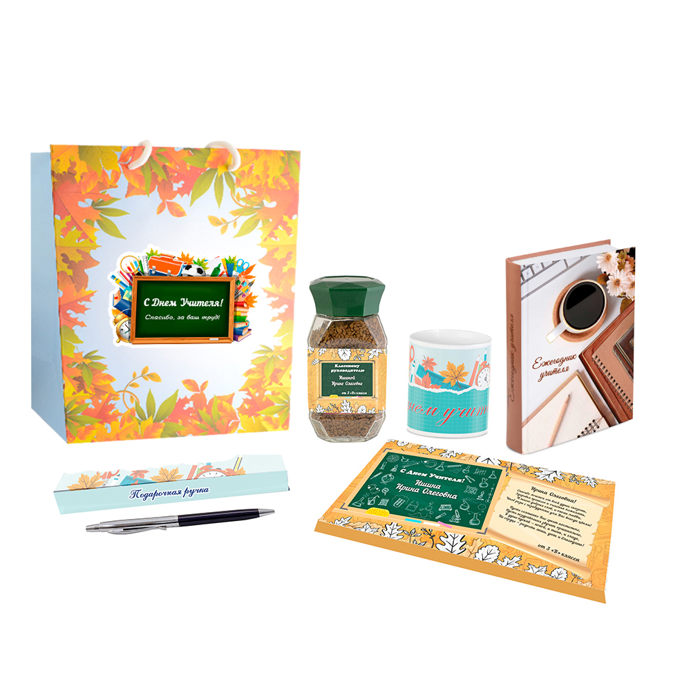 - В наборе: подарочный пакет, ручка в футляре, кружка, ежегодник для учителя, конфеты Merci, кофе