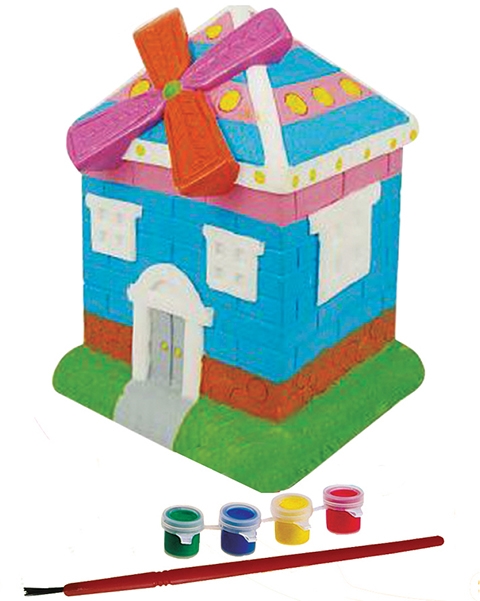 Раскрасьте фигурку, и у вас получится яркая и красивая мельница, которая может использоваться в качестве копилки. Рельефная поверхность поможет аккуратно, и, главное, быстро создать маленький шедевр, который украсит интерьер и станет гордостью вашего ребенка.