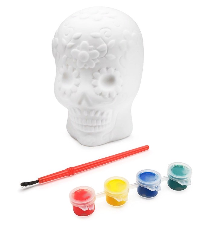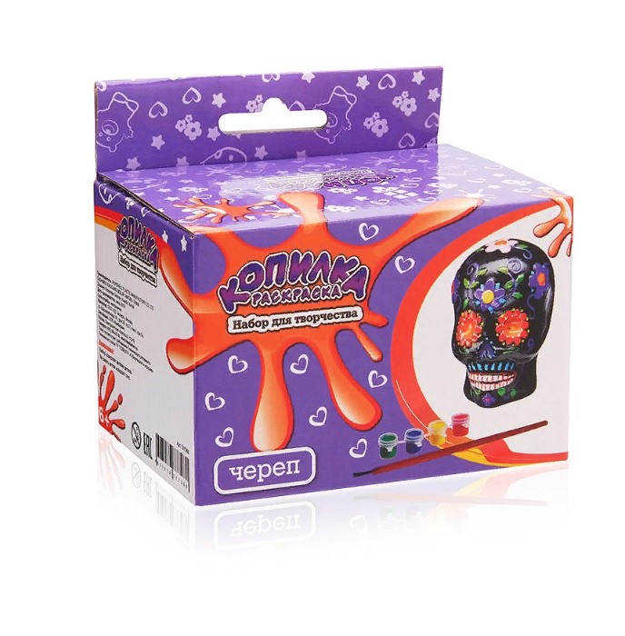 Череп выполнен из пластика, поэтому он легкий, прочный и небьющийся. Монетки кладут внутрь через прорезь сверху, а достают с помощью специальной заглушки на дне копилки. В наборе для творчества также есть краски и кисточка для раскрашивания. Вам остается лишь проявить фантазию в создании своей уникальной поделки.