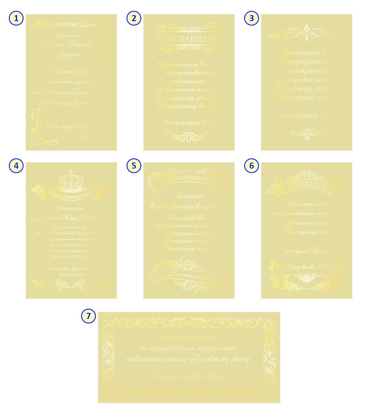 Цвет пригласительного и цвет нанесения текста на Ваш выбор, например в цвет выпускных лент. (При заказе указать номер дизайна пригласительного)