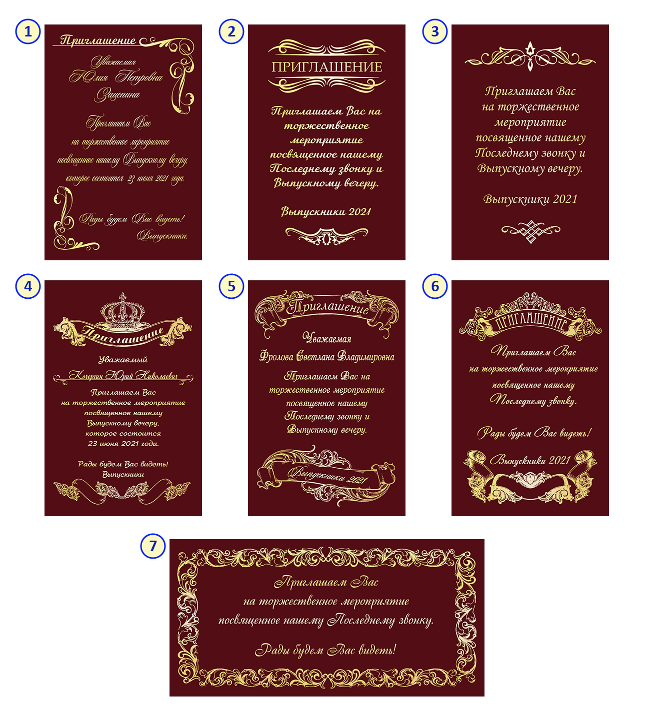 Цвет пригласительного и цвет нанесения текста на Ваш выбор, например в цвет выпускных лент. (При заказе указать номер дизайна пригласительного)