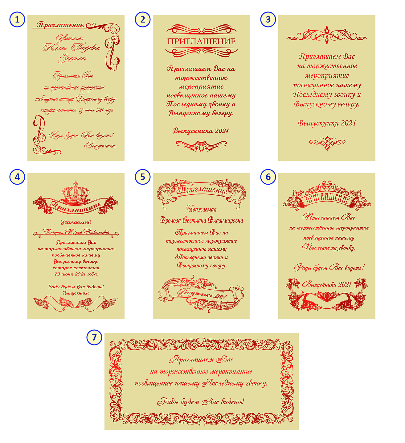 Цвет пригласительного и цвет нанесения текста на Ваш выбор, например в цвет выпускных лент. (При заказе указать номер дизайна пригласительного)