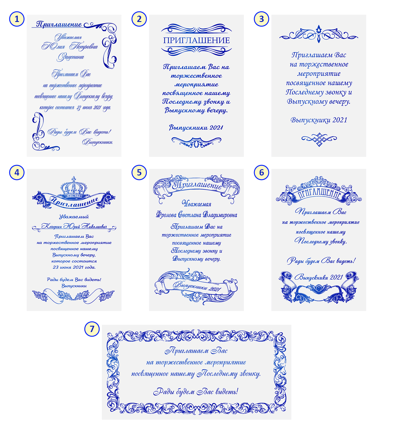Цвет пригласительного и цвет нанесения текста на Ваш выбор, например в цвет выпускных лент. (При заказе указать номер дизайна пригласительного)