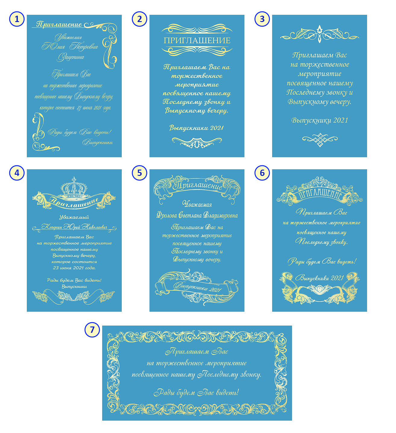 Цвет пригласительного и цвет нанесения текста на Ваш выбор, например в цвет выпускных лент. (При заказе указать номер дизайна пригласительного)