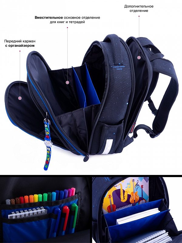 - в переднем отделении место для тетрадей и органайзер для письменных принадлежностей