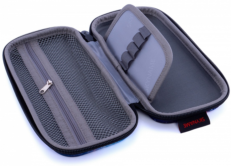 Пенал имеет одно большое отделение, разделенное перегородкой, на которой удобно можно разместить все ручки и карандаши, так же имеется удобное отделение-сеточка.