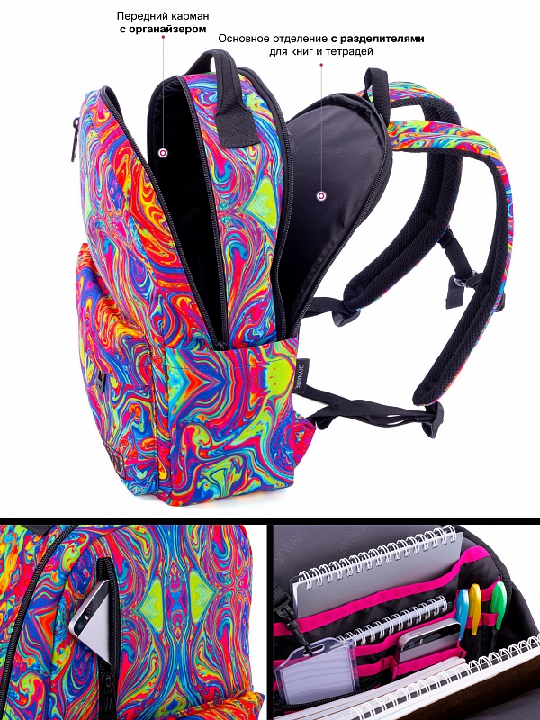 - в рюкзаке одно большое отделение, отделение возле спинки для больших тетрадей или ноутбука.