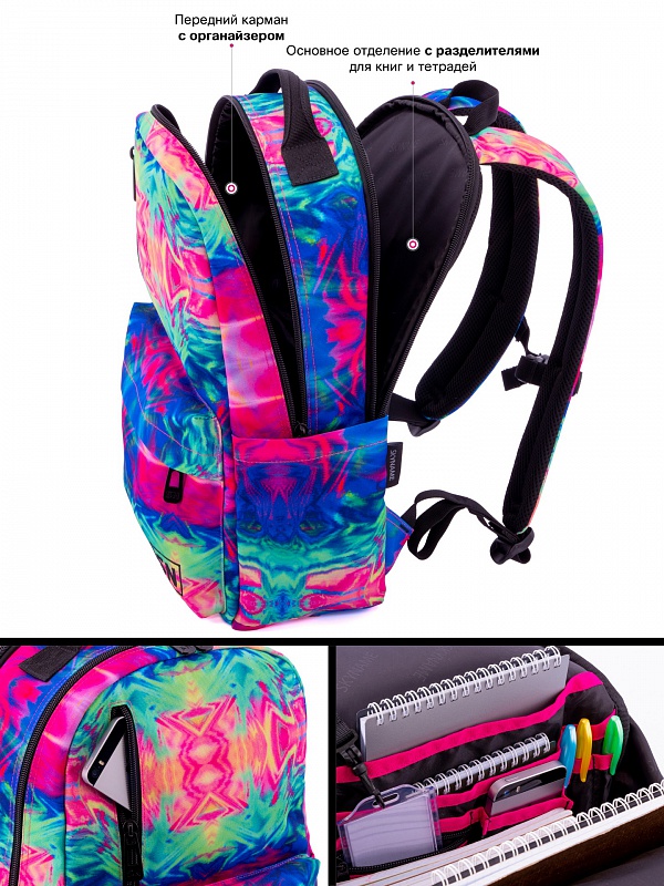 - в рюкзаке одно большое отделение, отделение возле спинки для больших тетрадей или ноутбука.