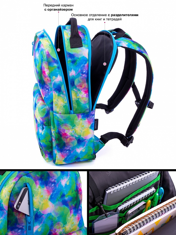 - в рюкзаке одно большое отделение, отделение возле спинки для больших тетрадей или ноутбука.