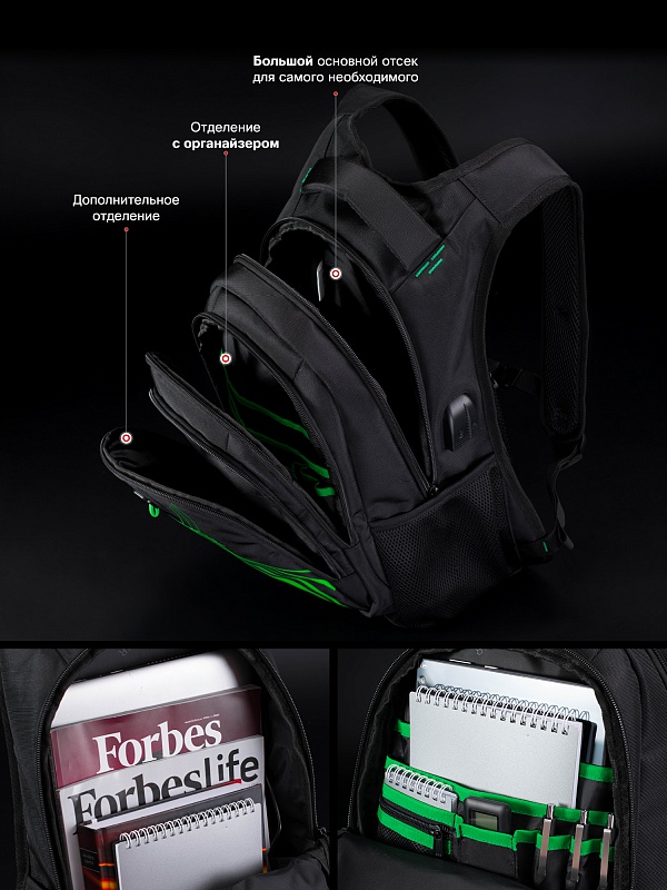 - в первом (у спинки) – основное большое отделение с карманом.