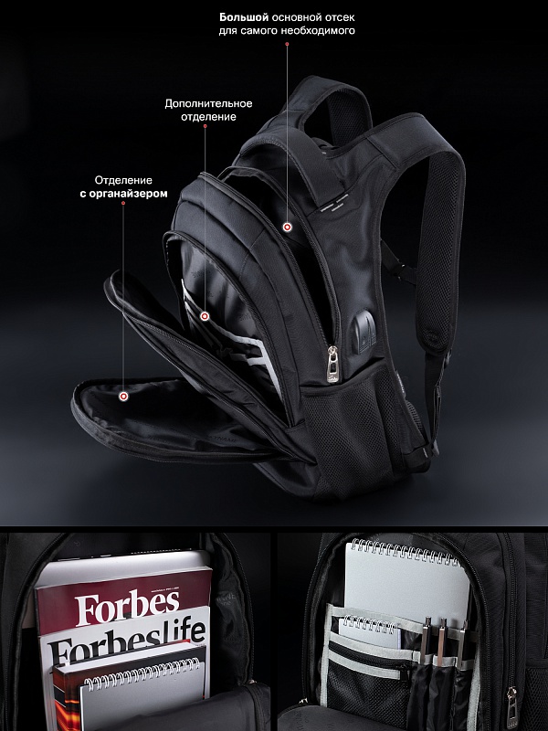 - в первом (у спинки) – основное большое отделение с карманом.
