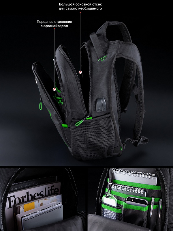 - в первом (у спинки) – основное большое отделение с карманом.