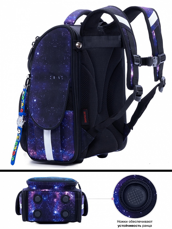 - светоотражающие элементы расположены на передней, задней и боковой частях ранца для обеспечения безопасности в темное время суток.