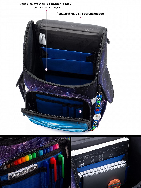 - в центральном отделении имеется два разделителя и резинка для крепления школьных принадлежностей.